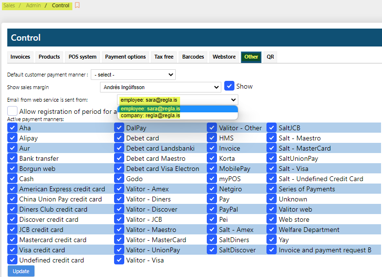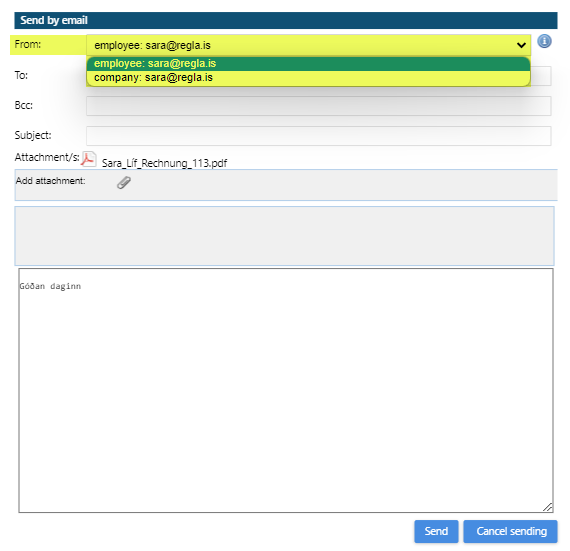 When sending an email from Regla it self it is possible to select whether the sender is the logged in user or the company.