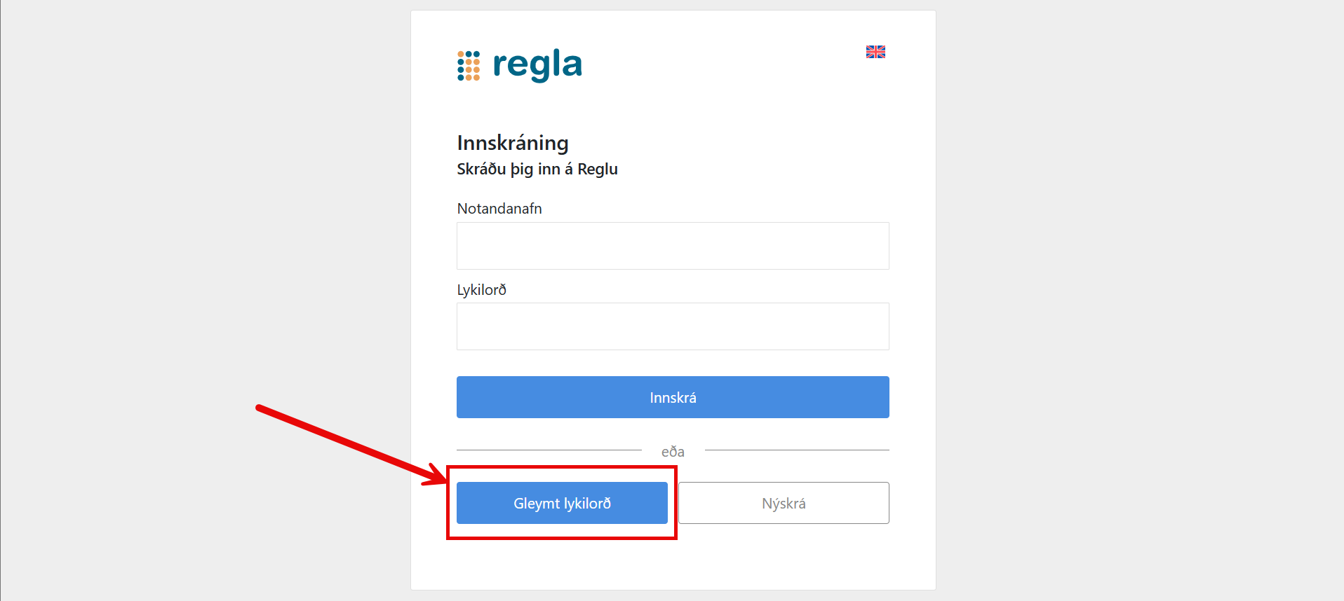 Við innskráningargluggann í Reglu: