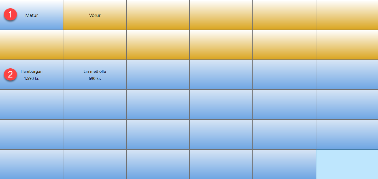 - Hér birtast vöruflokkar og staðsetningar fyrir veitingastaði (t.d. borðnúmer). Ef ýtt er á vöruflokk opnast hann og birtir vörurnar í viðkomandi vöruflokki.