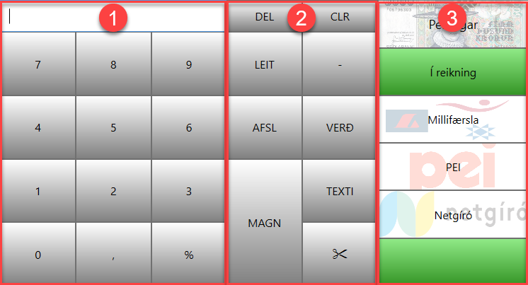Peningar, kort, kort handvirkt, í reikning, PEI, Netgíró, Aur, gjafabréf, inneign, erlendir seðlar, símgreiðsla og fleira.