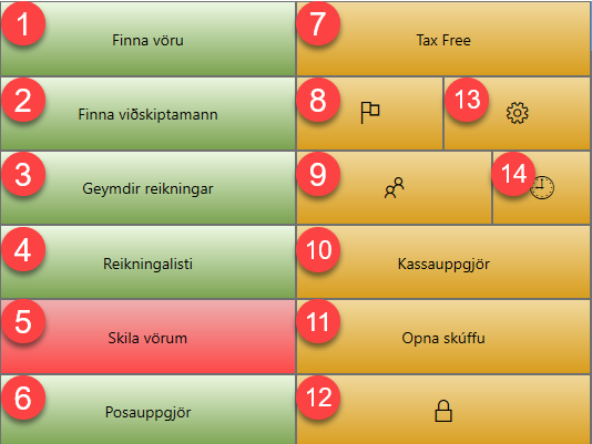 - Hérna birtast vörur sem hægt er að ýta á til þess að bæta þeim á reikning. Ef fleiri en 25 vörur eru í viðkomandi vöruflokki birtist ör í neðra hægra horni sem flettir um blaðsíðu og sýnir næstu vörur.