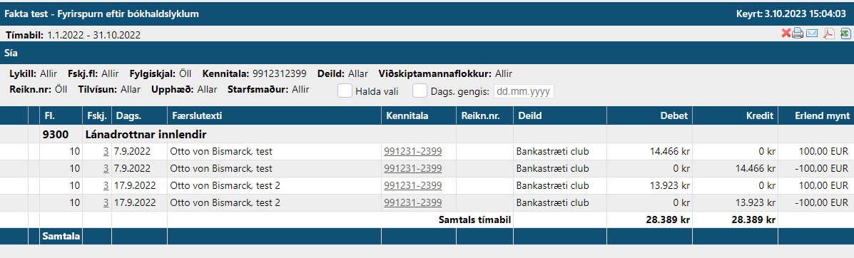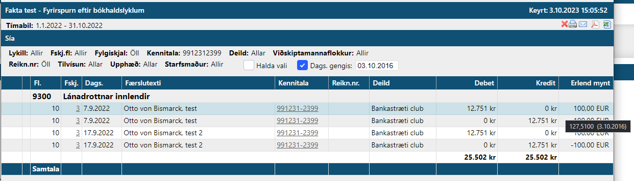 Það sem breyttist í yfirlitinu er nýr dálkur sem birtir upphæðina í erlendu myntinni og miðast þá við færsludagsetningu. Til þess að fá gengið á annarri dagsetningu hakar maður bara við Dags. gengis og velur dagsetninguna. Sjálfgefin dagsetning er dagurinn í dag. Til þess að sjá gengi þeirrar dagsetningar er hægt að láta bendilinn sitja yfir upphæðinni í hverri línu.