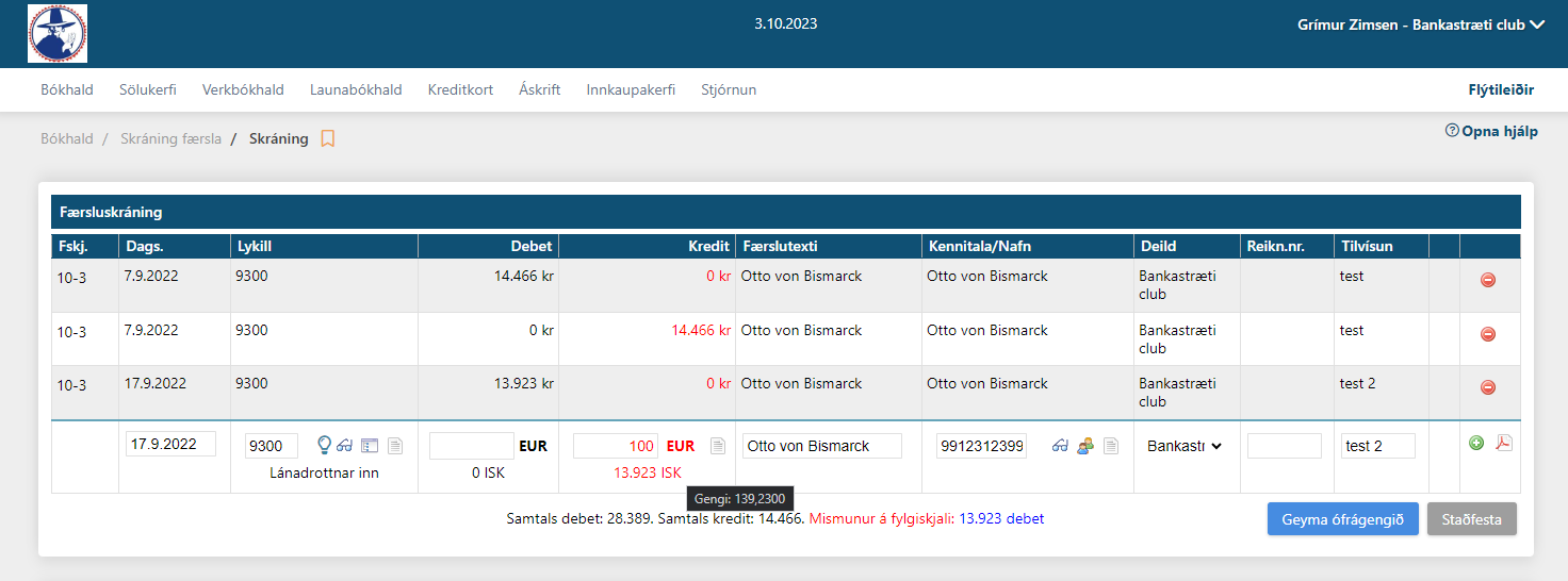 Það sem breyttist í skráningunni er sem sagt að þegar viðskiptavinur með erlendan gjaldmiðil er sleginn inn þá uppfærist myntkóðinn og upphæðin birtist í íslenskum krónum (eða þeim gjaldmiðli sem fyrirtækið notar) fyrir neðan innsláttarreitinn. Gengið miðast við þá dagsetningu sem er skráð framar í línunni og sjálft gengið birtist í tooltip ef bendillinn er látinn sitja yfir íslensku upphæðinni.