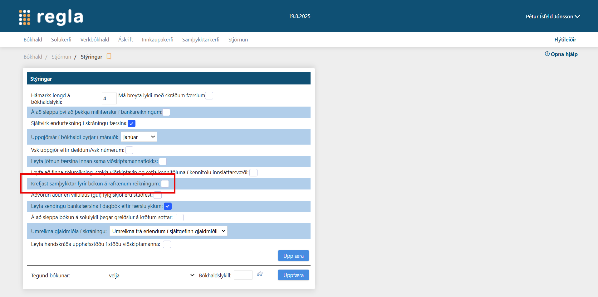 Til að virkja þetta, veldu “Bókhald > Stjórnun > Stýringar” og hakaðu við “Krefjast samþykktar fyrir bókun á rafrænum reikningum”.