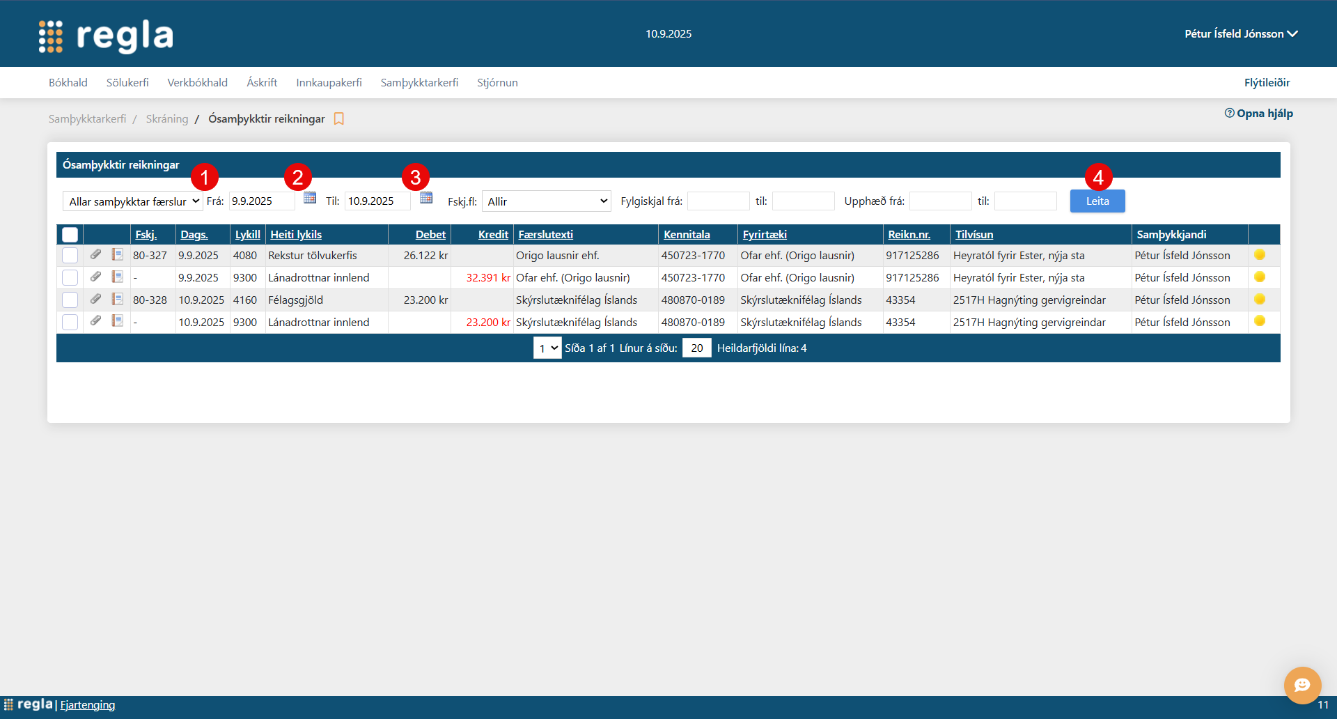 - Veldu leita til að kalla fram reikninga fyrir gefna afmörkun, tímabil, fylgiskjals# og uphæð