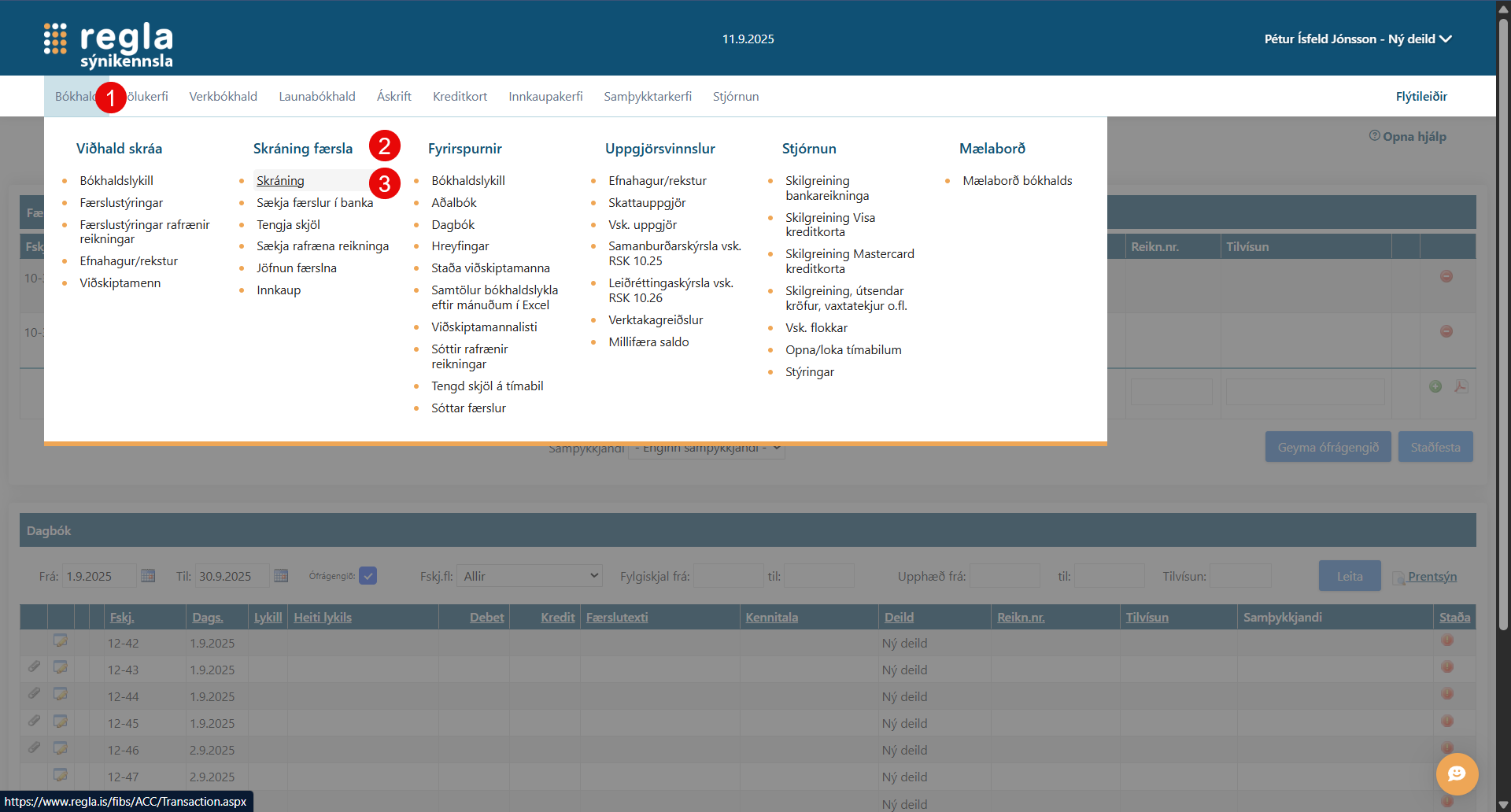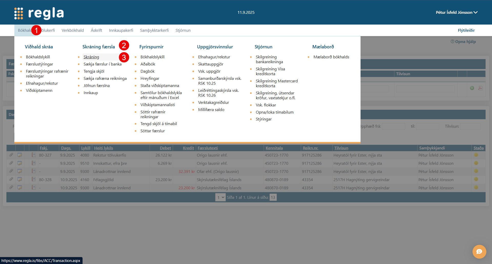 - Hægt er að sjá stöðu færslu en gult þýðir að hún sé villulaus og tilbúin til bókunar