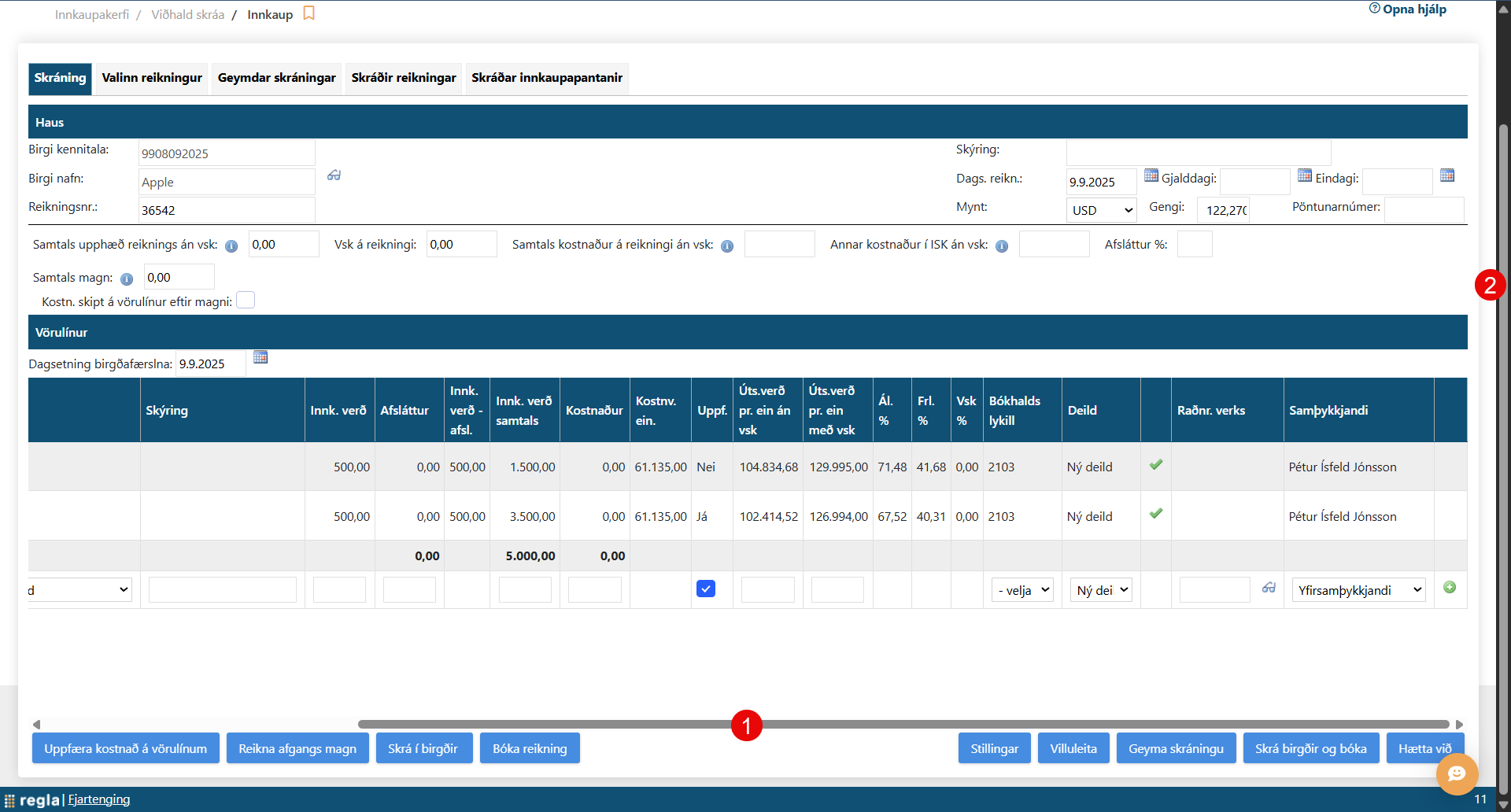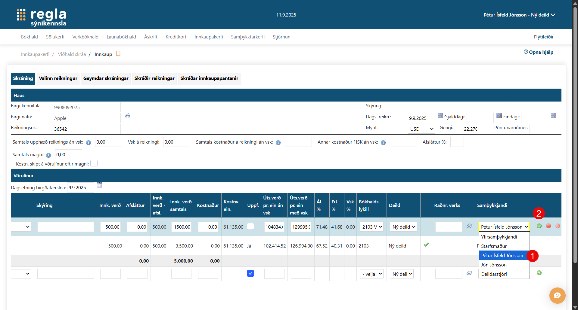 Þegar verið er að skrá línur í innnkaupareikning er hægt að velja samþykkjanda per línu.
