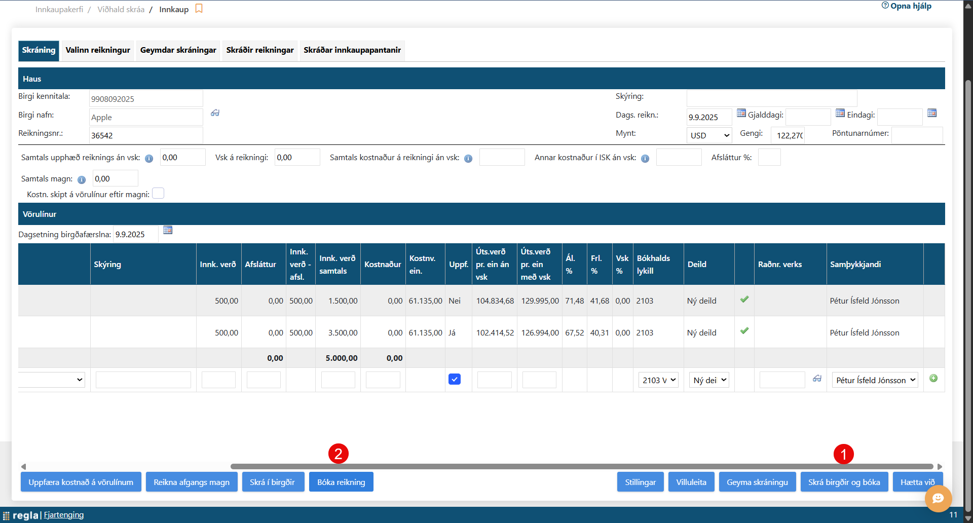 - Veldu Bóka reikning til að bóka án þess að skrá birgðir (þegar reikningur er samþykktur bókast hann)