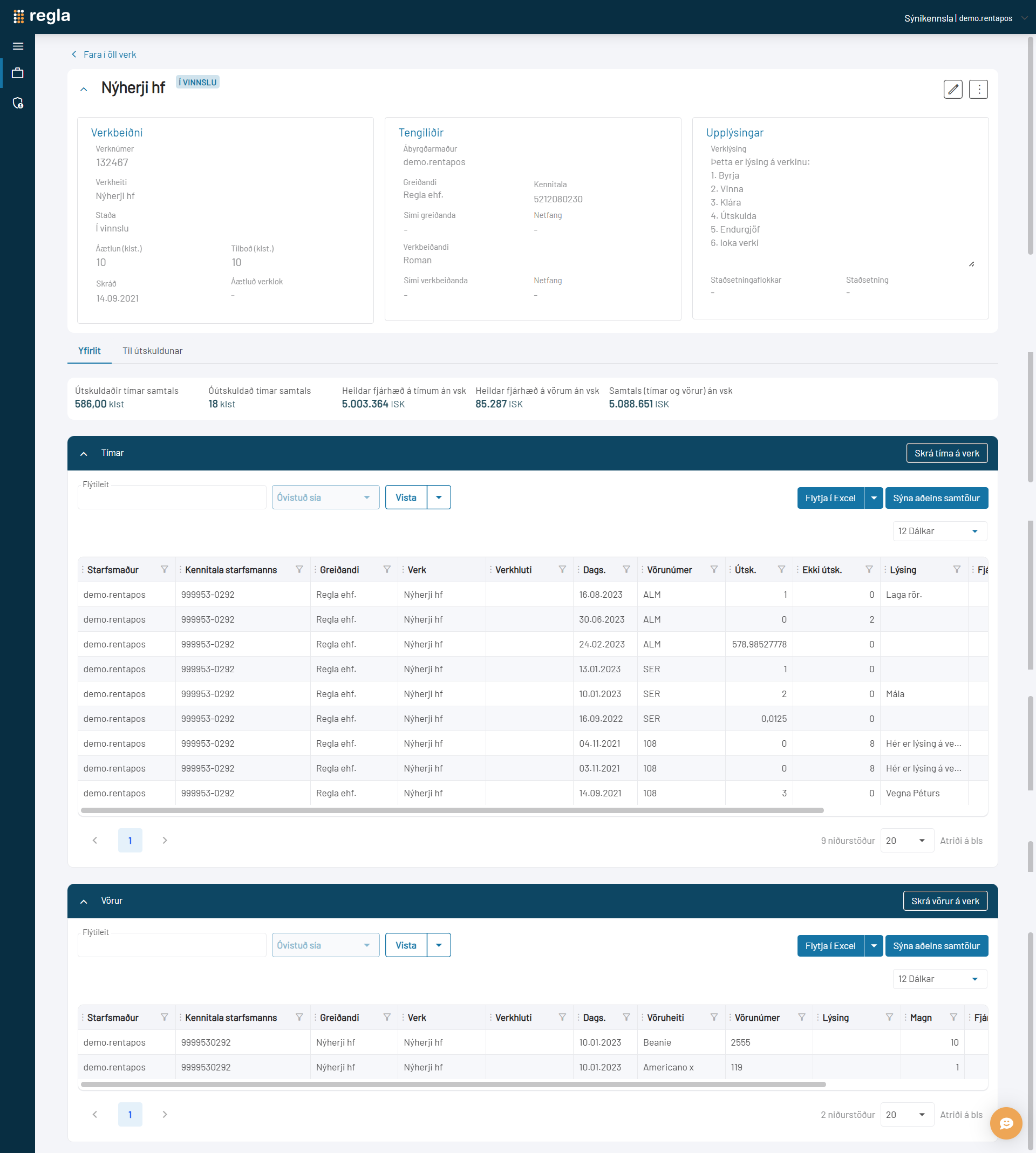Hér má sjá yfirlit verkefnis með ítargögnum um verkið í efsta fleka, tölulega samantekt á verkinu, tímaskráningu og neðst kemur efnisskráning fram.