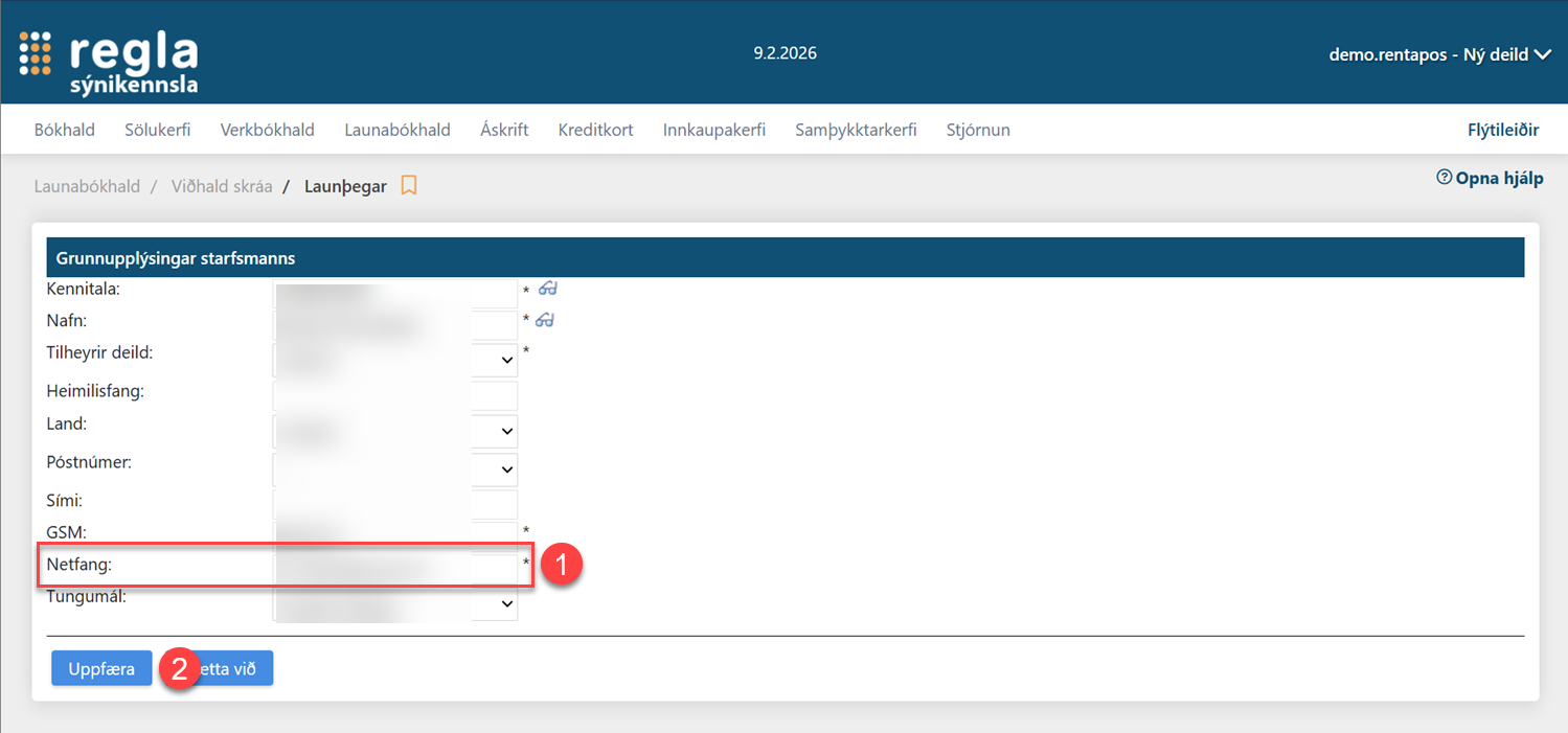Uppfæra tölvupóst launþega Pétur Ísfeld Jónsson Febrúar 09, 2026 10:00 Uppfærð Til að uppfæra tölvupóst launþegaVeldu LaunabókhaldVeldu LaunþegarVeldu launþegan sem þú vil uppfæra tölvupóst fyrirSláðu inn réttan tölvupóstVeldu uppfæra Tengdar greinar Launþegar Grunnupplýsingar Athugasemdir 0 comments Vinsamlegast innskráning til að skilja eftir athugasemd.